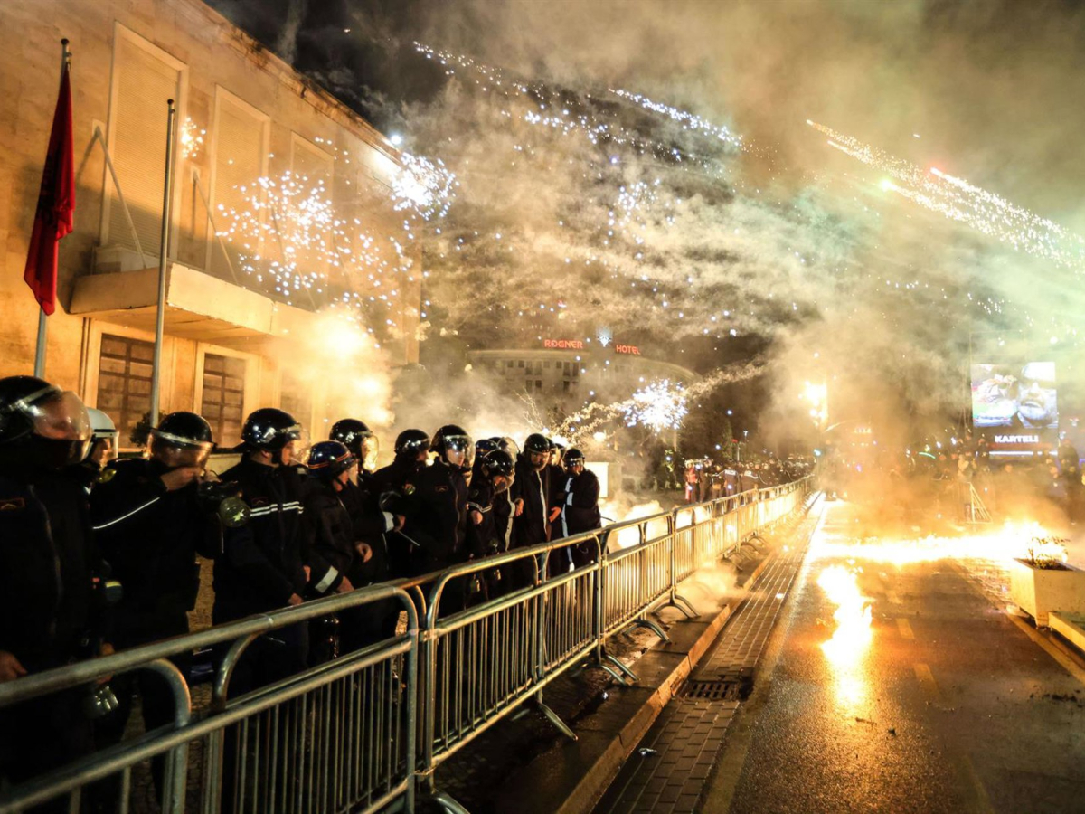 La Policía de Albania protege la oficina del primer ministro, Edi Rama, en protestas violentas en Tirana.  Europa Press/Contacto/Armando Babani
