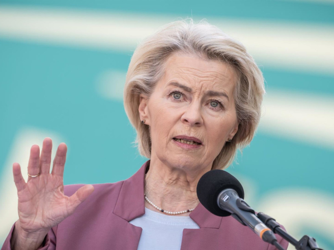 27 April 2026, Berlin: Ursula von der Leyen, President of the EU Commission, speaks before the start of the two-day meeting of the CDU/CSU parliamentary group's executive committee. Photo: Michael Kappeler/dpa Michael Kappeler/dpa