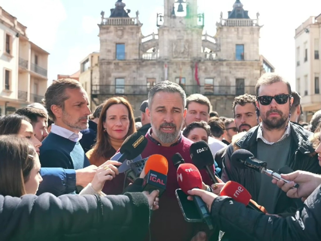 El presidente de Vox, Santiago Abascal, comparece ante los medios en Astorga (León) en un acto de campaña electoral. EUROPA PRESS