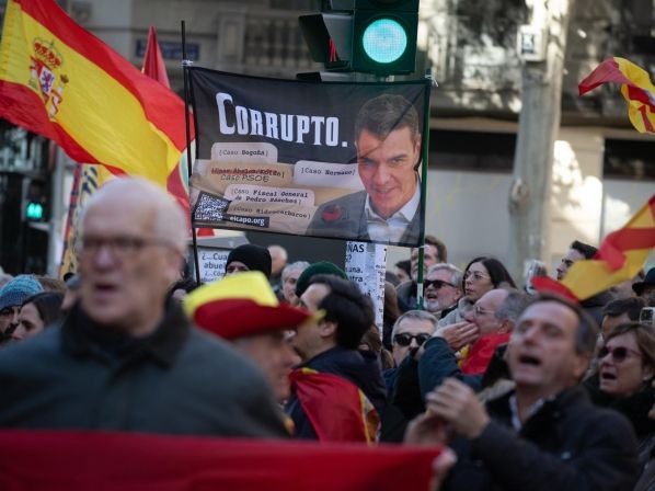 Además, se exhibieron banners con la imagen de Sánchez y su esposa Begoña Gómez etiquetados como ‘culpables’, y otros acusando a Sánchez de ‘Corrupto’. Algunos asistentes llevaron banderas preconstitucionales y billetes falsos de 500 euros con la imagen de Sánchez.