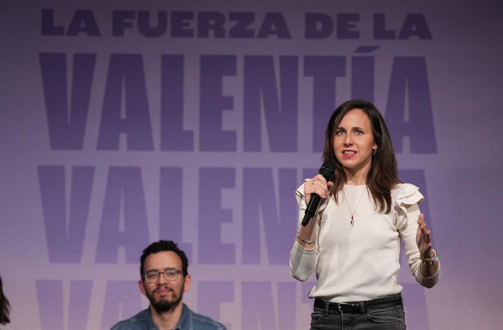 La secretaria general de Podemos, Ione Belarra, interviene durante el acto de cierre de campaña electoral de Podemos en Castilla y León, a 13 de marzo de 2026, en Valladolid, Castilla y León (España). Photogenic/Claudia Alba - Europa Press