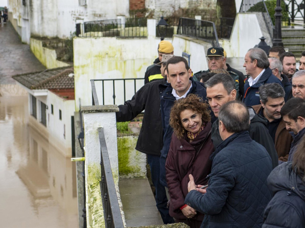 El presidente del Gobierno, Pedro Sánchez, en Jaén por el desbordamiento del Guadalquivir, con la ministra María Jesús Montero. A 09 de febrero de 2026, en Villanueva de la Reina, Jaén (Andalucía, España). C.G. - Europa Press