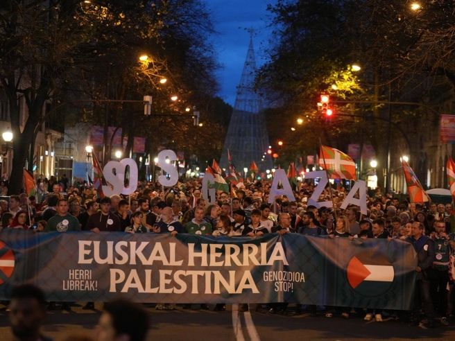 Grupos como Palestina Gu ere bai!, Gure Esku y Gernika-Palestina Herri Ekimena encabezaron la primera marcha a las 17:30, con un fuerte dispositivo de seguridad en vigencia. La cabecera de la marcha mostraba las banderas palestina e ikurriña bajo el lema “Euskal Herria Palestina. Genozidioa stop”. Activistas y políticos locales, incluidos miembros de EH Bildu, participaron en la manifestación, que también contó con la presencia de figuras públicas como el exfutbolista Mikel San José.
