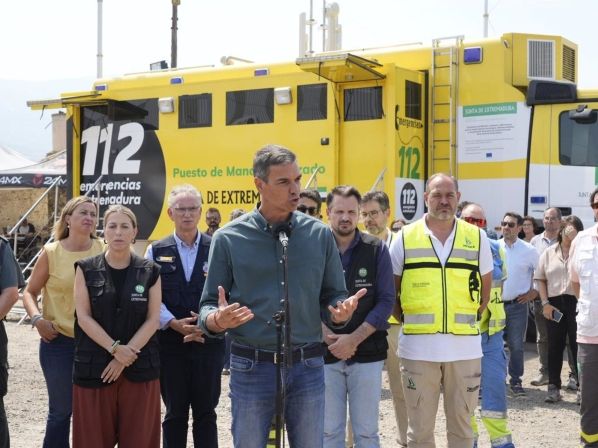 El martes por la mañana, Sánchez también estuvo en el Puesto de Mando Avanzado del incendio de Jarilla, Cáceres, junto a María Guardiola, presidenta regional.
