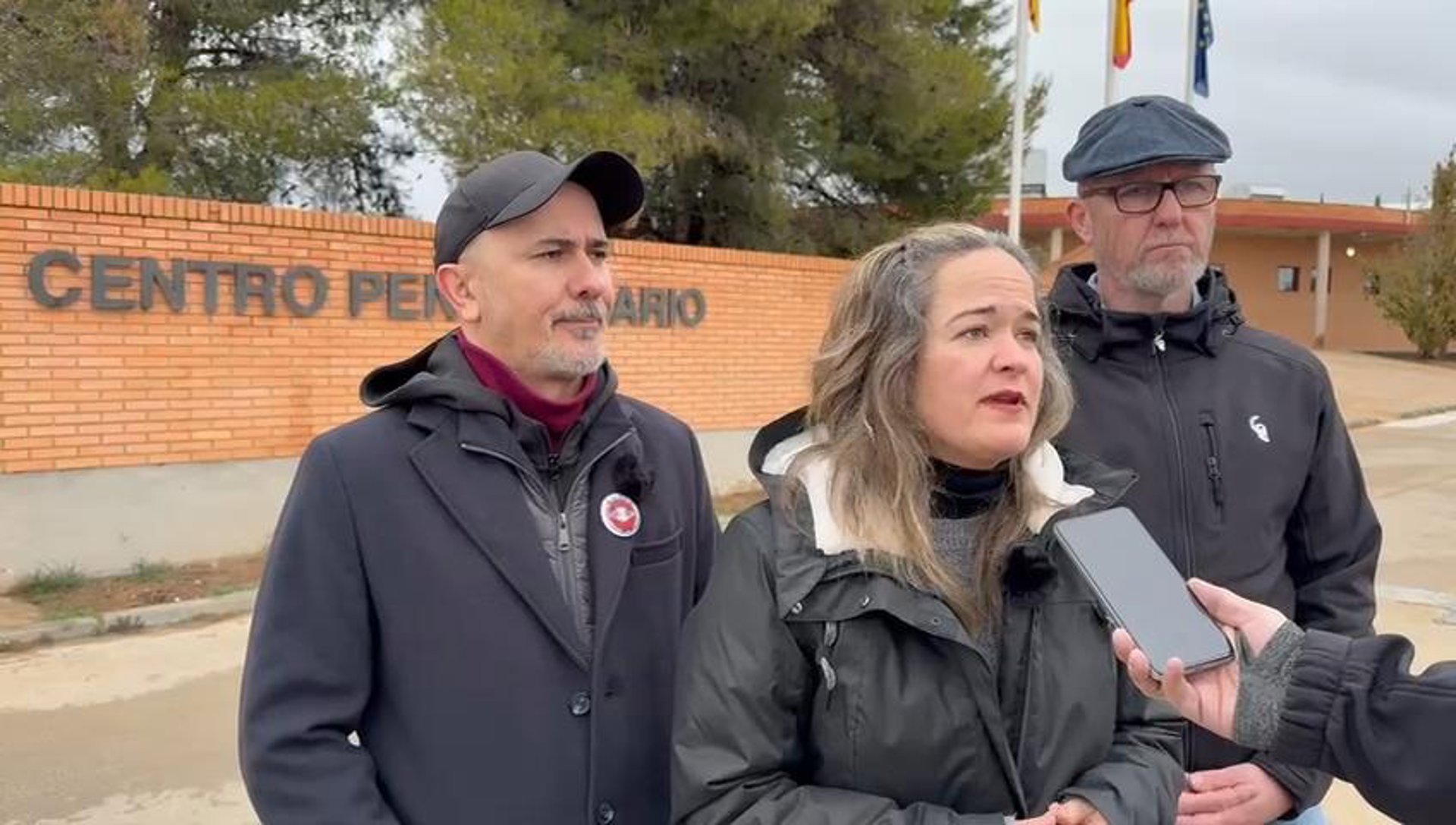 María Goikoetxea, Francho Aijón y Ricard Mitjana, frente al Centro Penitenciario de Zuera. PODEMOS