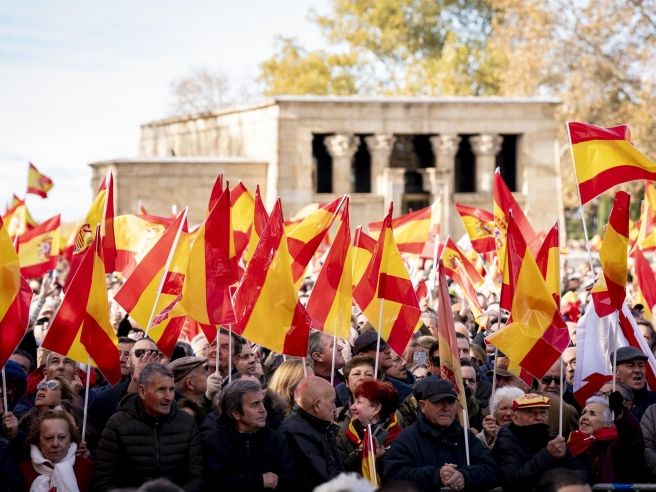 A pesar del frío, la respuesta ciudadana fue ‘masiva’, llenando el lugar del evento y áreas cercanas, desde la plaza de España hasta el Paseo Pintor Rosales, en una manifestación sin siglas pero con abundantes banderas de España.