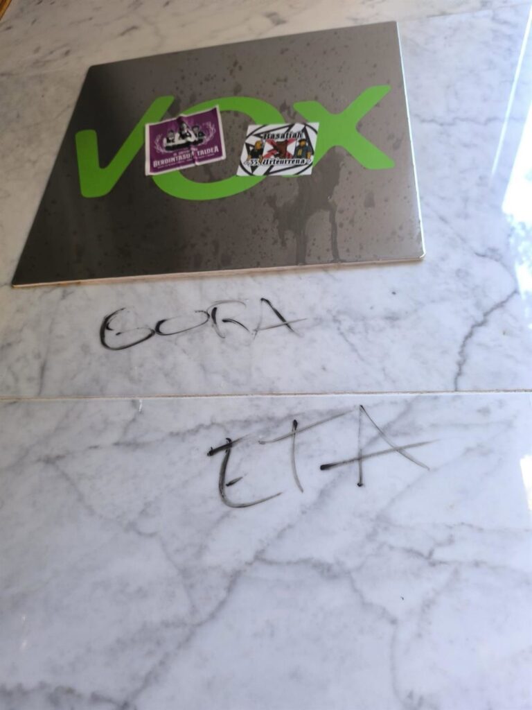 La fachada de la sede de Vox se encontró cubierta de pegatinas que ocultaban el nombre del partido, salivazos en el rótulo, pintura encima del letrero ‘Afíliate’ y un ‘Gora ETA’ escrita en la entrada al edificio.