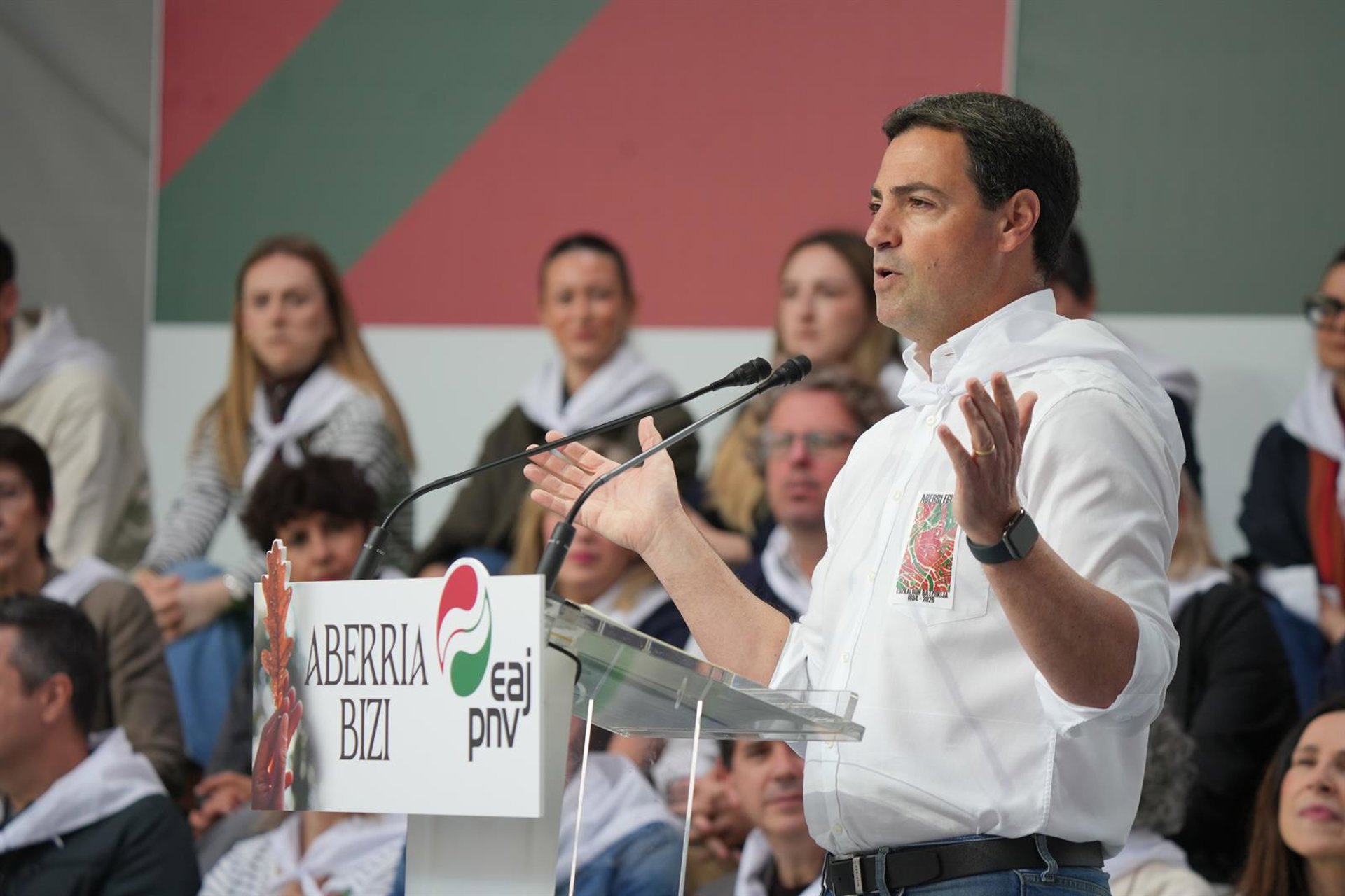 Durante el acto organizado por el PNV en la Plaza Nueva de la capital vizcaína, bajo el lema 'Aberria Bizi (Vive el país)', en el que también ha tomado la palabra el presidente del EBB, Aitor Esteban, Pradales ha subrayado que el Aberri Eguna es un “día de celebración y encuentro”, pero igualmente de “hacer balance”. Ha asegurado que, “a pesar de que hay quien se empeña en lo contrario, la Casa Vasca crece y nuestra Nación avanza”.
