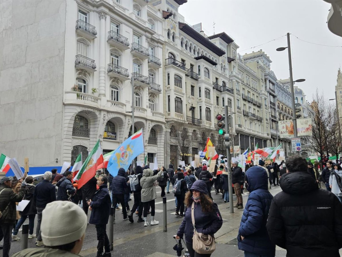 Decenas de personas se han concentrado este sábado en el centro de Madrid para expresar su rechazo a las autoridades de Irán y mostrar su apoyo a Reza Pahlavi, hijo del derrocado sah y uno de los opositores más visibles en el exilio.