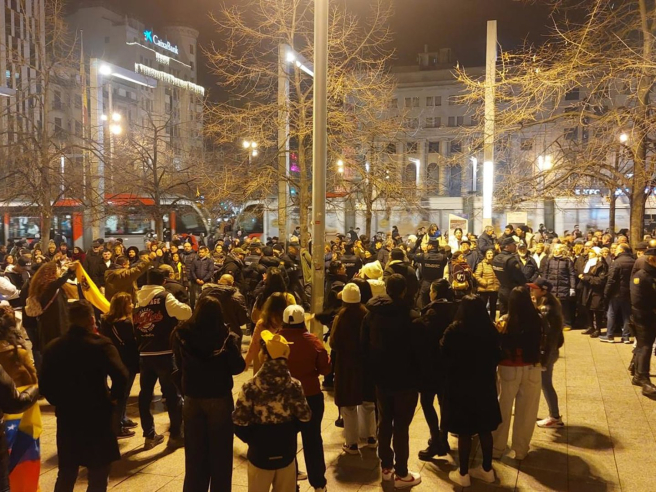 La plaza de España de Zaragoza ha sido este sábado escenario de varios minutos de tensión al confluir, en el mismo punto, decenas de venezolanos que celebraban la caída de Nicolás Maduro tras una intervención militar de Estados Unidos con bombardeos sobre Caracas y otras ciudades, y una concentración de rechazo al "imperialismo" estadounidense en América Latina, todo ello sin que se produjeran incidentes graves.