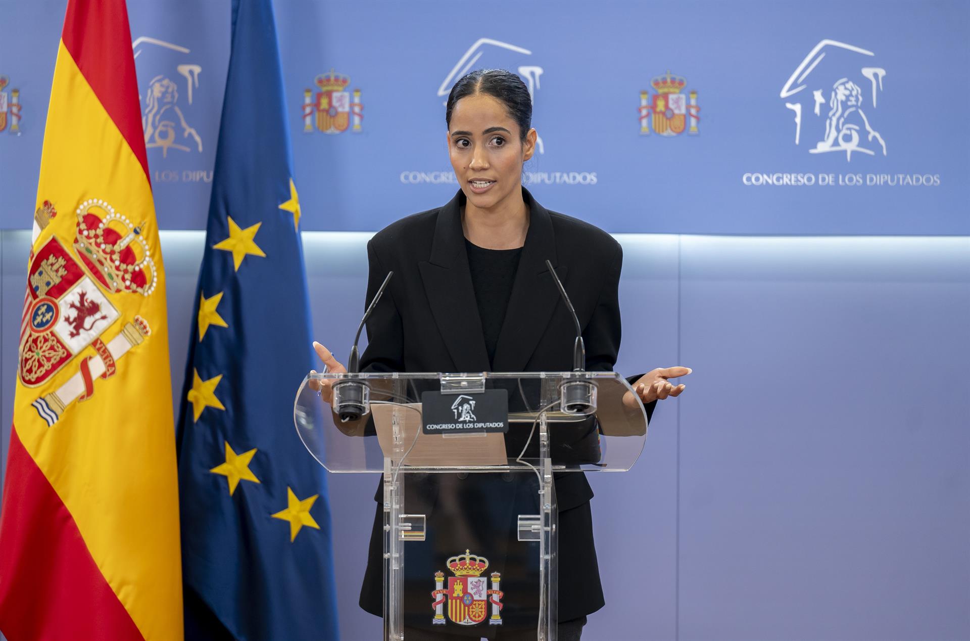 La portavoz de Más Madrid en el Congreso, Tesh Sidi, durante una rueda de prensa en el Congreso de los Diputados, a 28 de abril de 2026, en Madrid (España). Alberto Ortega - Europa Press