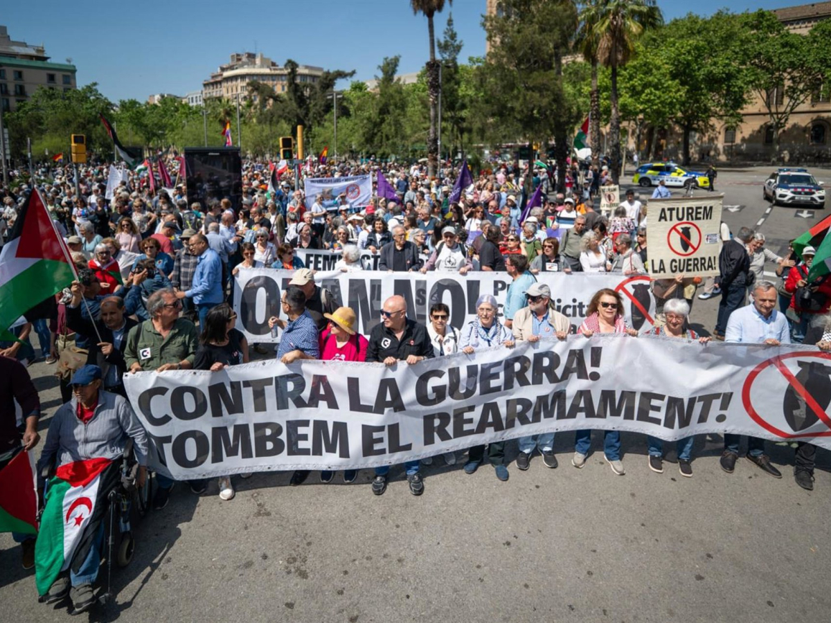 A lo largo del recorrido se han coreado consignas como “Israel asesina, Europa patrocina”, “Més pau i menys guerra”, “Free Palestine” o “No a les armes nuclears”, que han marcado el tono de rechazo al conflicto y al aumento del gasto militar.