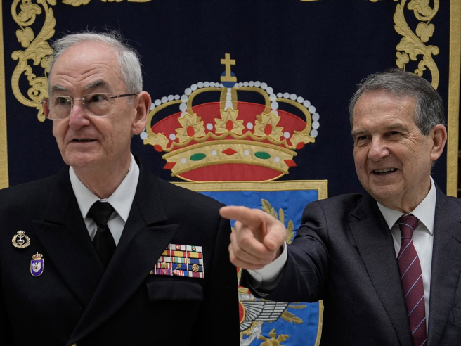 El Jefe del Estado Mayor de la Defensa, almirante general Teodoro Esteban López Calderón, junto al alcalde de Vigo, Abel Caballero, en la presentación de los actos con motivo del Día de las Fuerzas Armadas. ADRIAN IRAGO