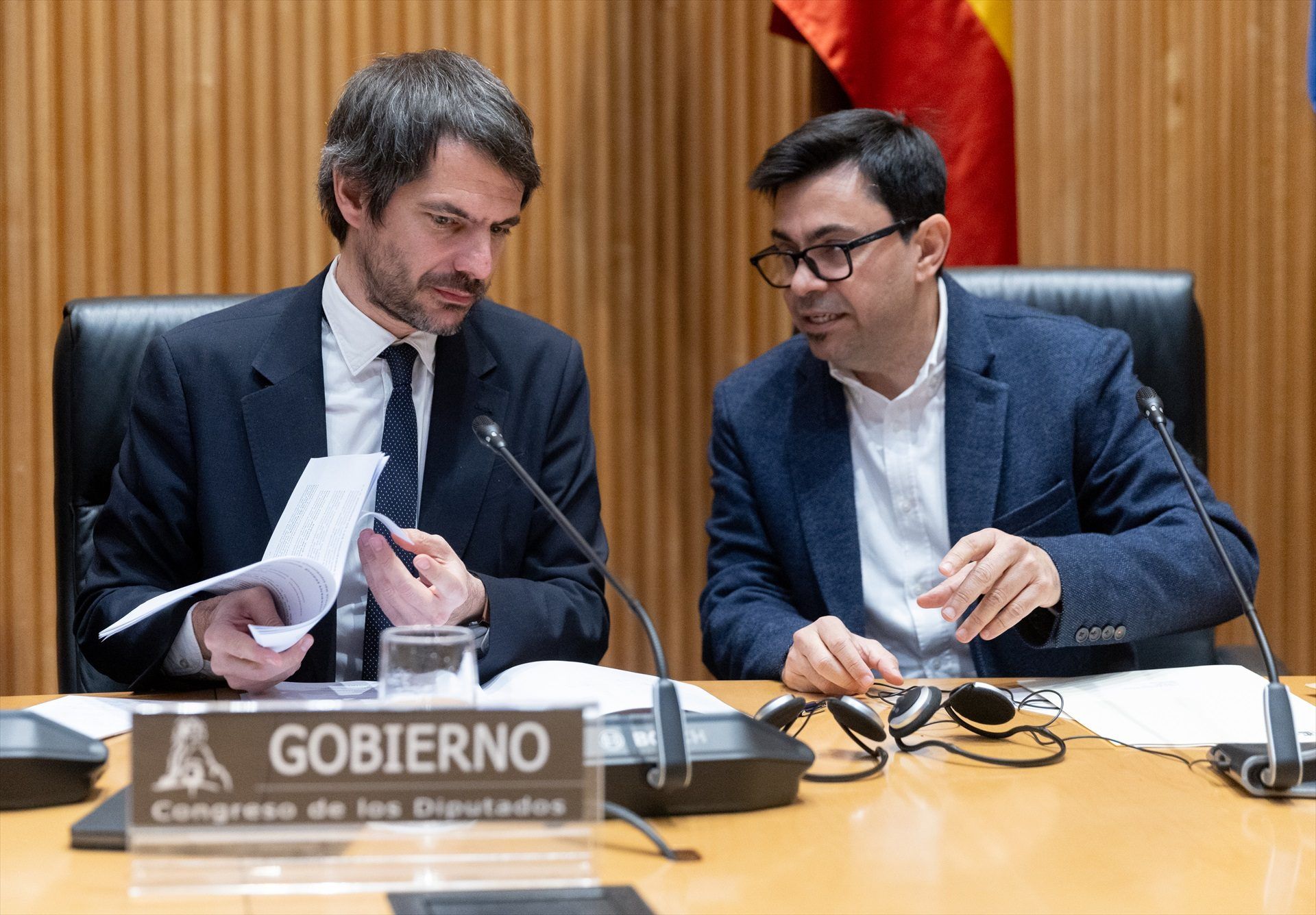 El ministro de Cultura, Ernest Urtasun (i), y el secretario primero de la Mesa del Congreso, Gerardo Pisarello (d), a su llegada a la Comisión de Cultura, en el Congreso de los Diputados, a 22 de enero de 2024, en Madrid (España). Fuente Eduardo Parra/ Eu