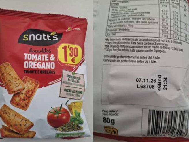 El lote implicado lleva la denominación ‘Bocaditos tomate & orégano’, identificado con el número 68708, con una fecha de caducidad programada para el 07/11/26 y el código de barras 8413164023198. El producto se ofrece en paquetes de 80 gramos.