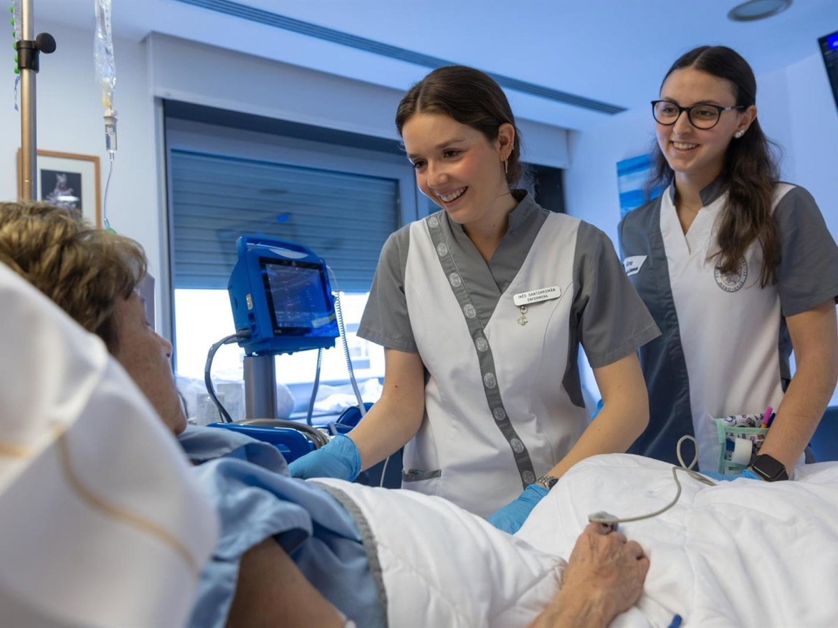 Una enfermera especializada, junto a una estudiante de Enfermería, atienden a una paciente hospitalizada en la planta de Oncología de la Clínica Universidad de Navarra. CLÍNICA UNIVERSIDAD DE NAVARRA