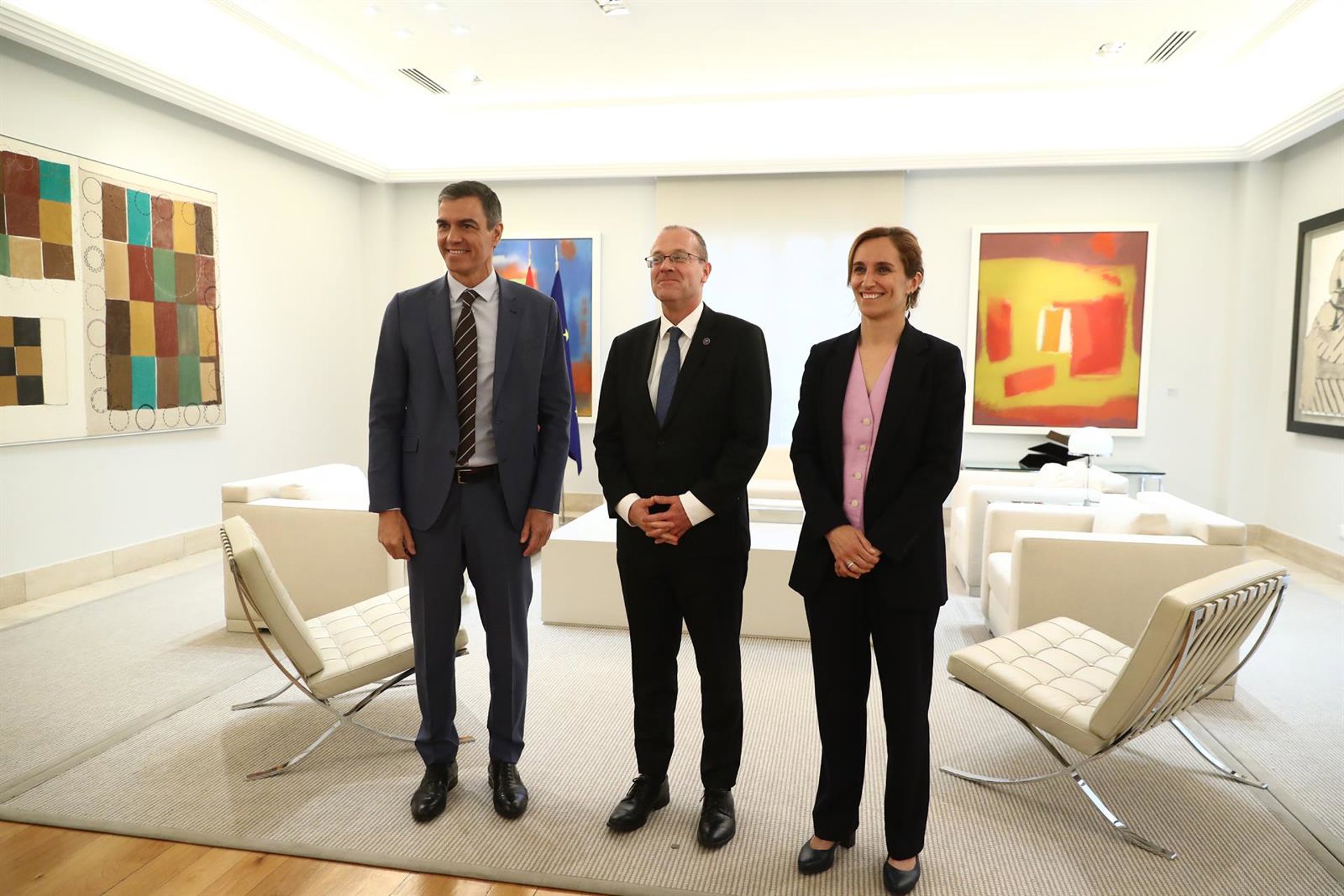 El presidente del Gobierno, Pedro Sánchez, acompañado por la ministra de Sanidad, Mónica García, junto al director regional de la OMS para Europa, Hans Kluge. POOL MONCLOA/FERNANDO CALVO