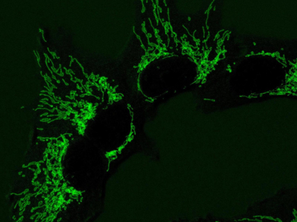 Imagen de microscopía de fluorescencia de las mitocondrias en células humanas sanas, que ayudan a producir los componentes básicos del ADN. CNIC
