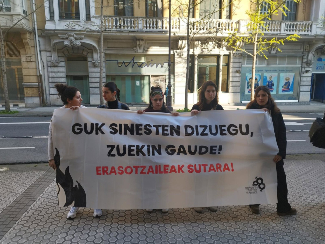 Las jóvenes, que fueron alumnas del procesado en un centro educativo de Oiartzun, han acudido acompañadas por integrantes de la Asamblea Feminista de Oiartzun. Portaban una pancarta en euskara en la que se leía “Os creemos, estamos con vosotras. Los agresores al fuego”.
