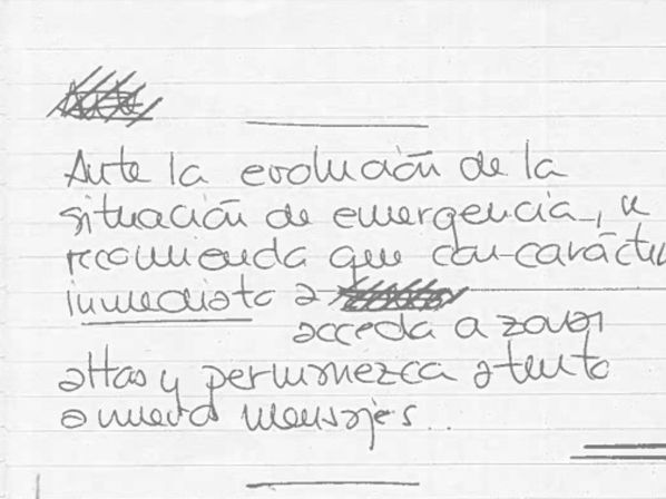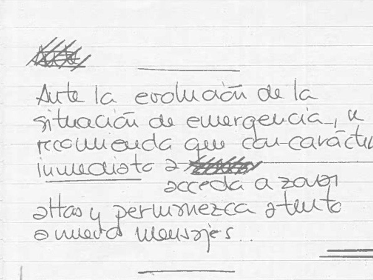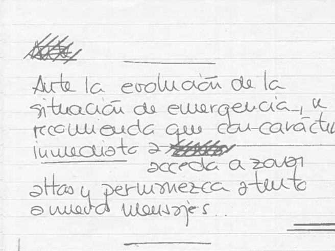 En las notas que ha aportado voluntariamente al juzgado, a las que ha tenido acceso Europa Press, figura un texto manuscrito que indica: “Ante la evolución de la situación de emergencia, se recomienda que con carácter inmediato acceda a zonas altas y permanezca atento a nuevos mensajes”.